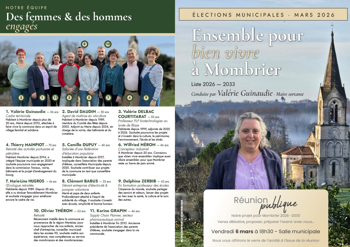 La liste conduite par Valérie Guinaudie rassemble 11 candidats, femmes et hommes de tous horizons, unis par leur attachement à Mombrier. Parmi eux :