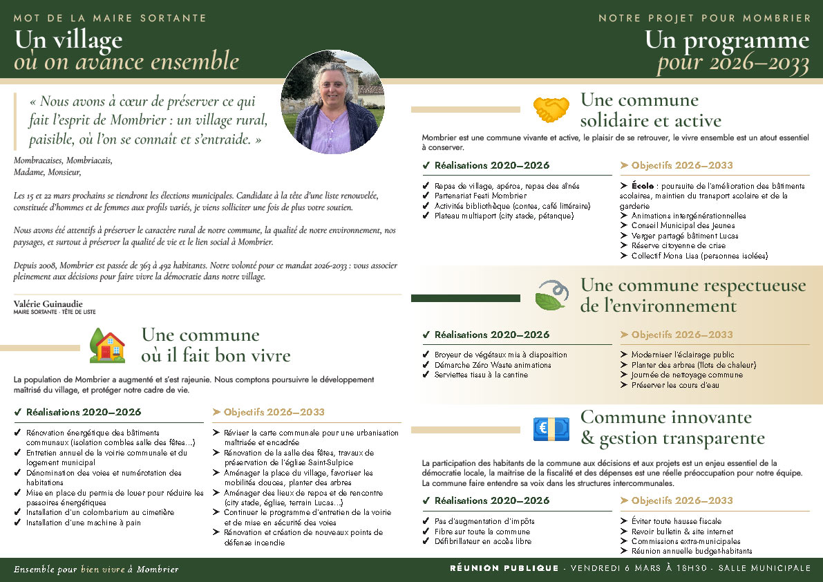 Les élections municipales approchent à grands pas à Mombrier ! Le 15 et 22 mars 2026, les habitants sont appelés à choisir leur équipe municipale pour les sept prochaines années. À la tête d’une liste renouvelée et diversifiée, Valérie Guinaudie, maire sortante, présente un projet ambitieux pour préserver l’esprit rural, solidaire et dynamique de Mombrier.